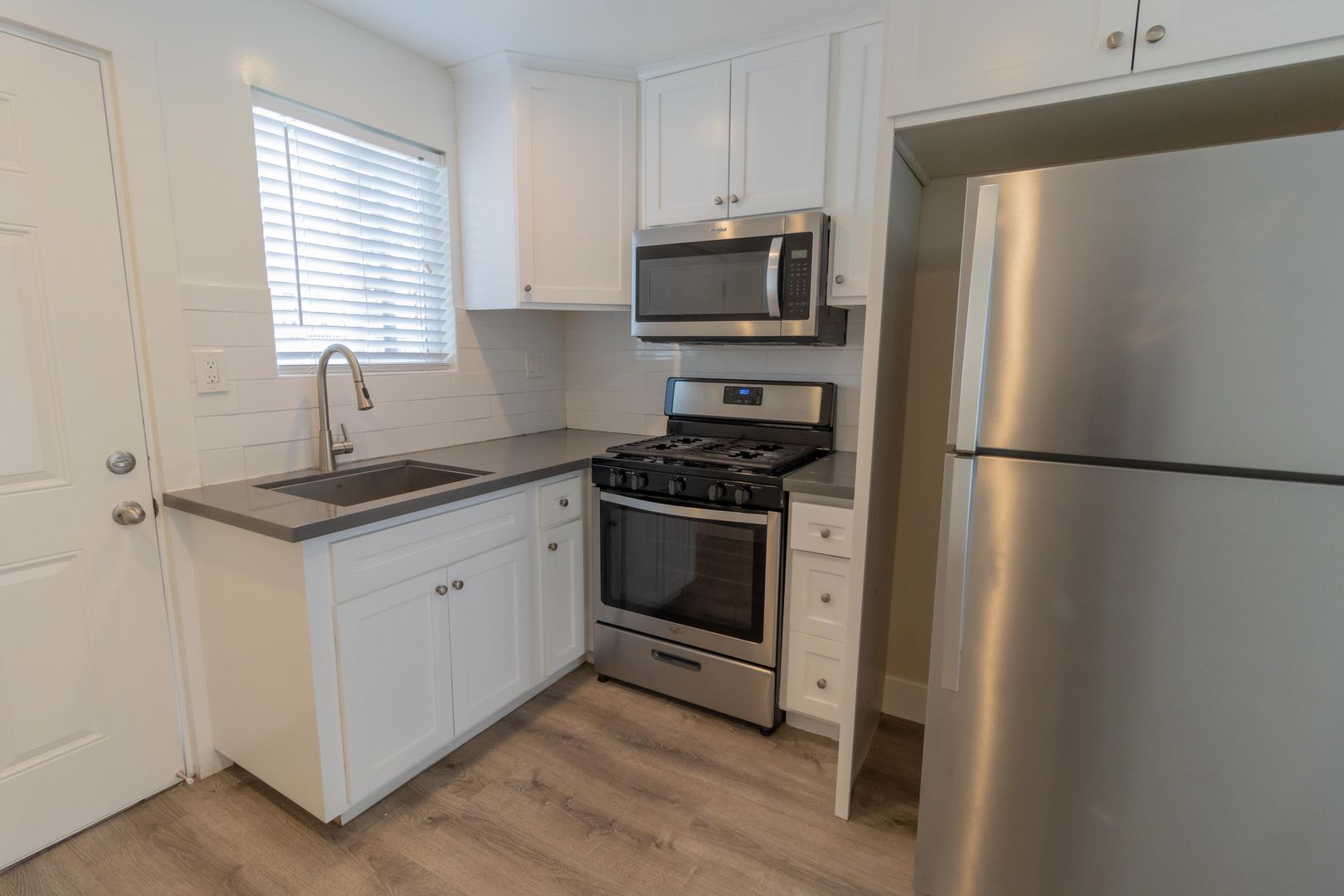 This lovely apartment is equipped with nice stainless steel appliances, and beautiful new quartz kitchen countertops and flooring.